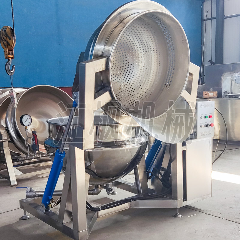 快速卤煮:开锅快,26分钟沸腾,可选多种加热方式有电磁加热/燃气加热/蒸汽加热/电加热导热油。 江枫翻筐夹层锅漂烫焯水卤煮锅,是在立式夹层锅的基础上,在内部加装带有冲孔的漏筐可实现自动液压翻筐出料功能,便于物料与汤汁快速、有效分离,可有效降低出料时间,节省人力、物力。 采用双液压杆,快速稳定,冲孔漏筐,可根据物料进行定制设计。