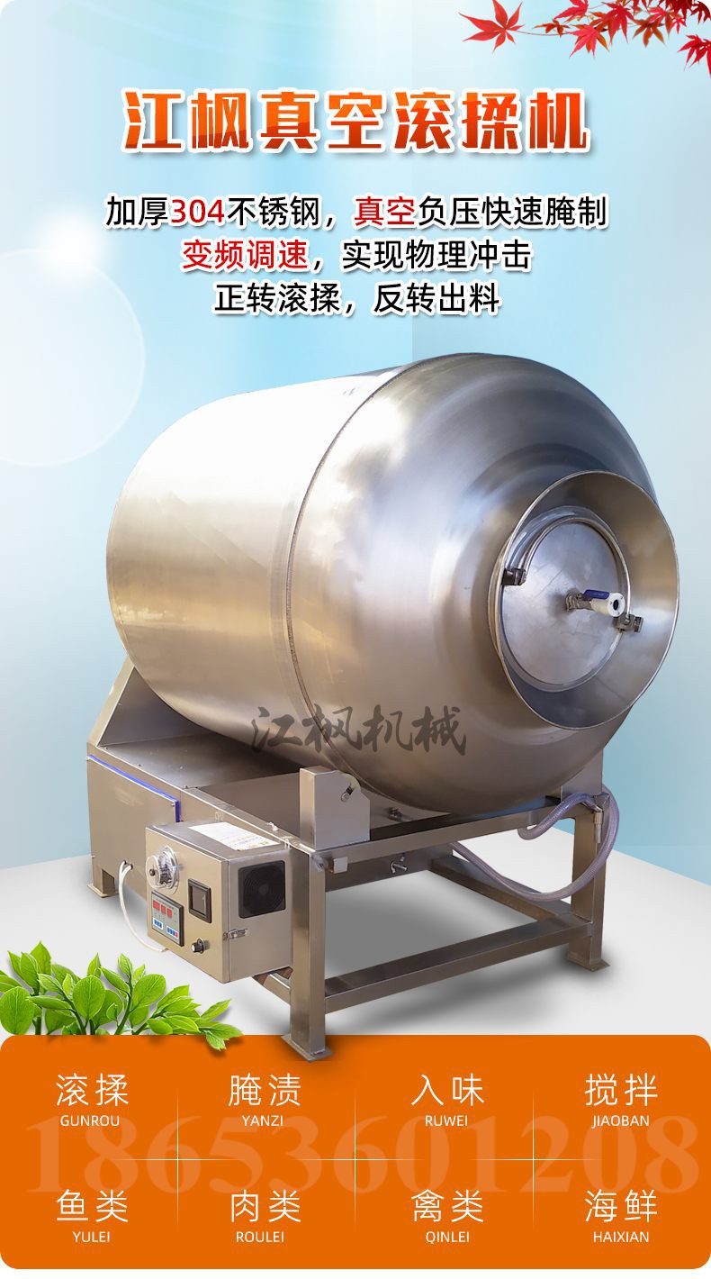 江枫真空滚揉机是一种在真空状态下利用物理冲击原理进行食品加工的机械设备,广泛应用于肉类深加工、面食制品加工、果蔬制品加工及制药行业等领域。其核心功能是通过滚筒内肉块或肉馅的上下翻动、撞击与摔打,促使腌渍液充分吸收,同时实现物料与辅料、添加剂的均匀混合。