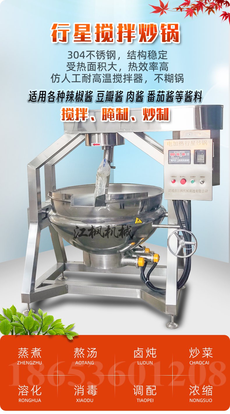 这款功能强大的江枫行星搅拌炒锅,专为食堂和中央厨房设计,特别适合螺蛳粉调料、香菇酱料、牛轧糖、火锅底料等多种食材的加工。操作简单又省时省力,生产效率高。设备支持高位出料,设计科学,便于操作和清洁。无论是炒酱、熬糖还是制作辣椒酱,都能轻松应对。性能稳定,质量可靠,是现代化厨房的好帮手!炒酱机,炒料机。
