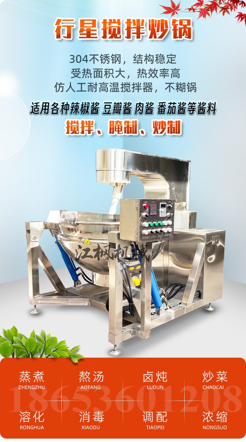 江枫行星搅拌炒锅使用先进的传动与密封结构,使传动部分与锅内洁净、卫生。采用变频调速动力,运行更平稳。另本机采用液压升降,翻锅运料,免拆装搅拌器,节省人力,降低劳动强度,是性能优良的食品加工设备。江枫行星搅拌炒锅优势: 1、容积大,产量高,设备全容积大可至600L,每锅可炒物料400kg。 2、不糊锅,独特的搅拌装置,可以覆盖锅体的每一个角落,使物料不糊锅。 3、搅拌均匀,特殊的结构设计,可使物料短时间内混合均匀,提高产品品质。 4、出料方便快捷:液压翻锅出料,使出料变得更方便快捷。 5、自动测温:测温控头与物料接触,直接测量物料温度,测温准确。 6、全自动化控制,只需人工按按钮即可,大大降低劳动强度。 7、易操作,人员简单培训即可上岗。8、主要材质为不锈钢,外表美观,易清理。 10、节能环保,节能率达40%以上,安全稳定无明火,节能更环保。